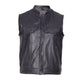 ART#2613 Description: A clean and minimalist black leather biker vest with a sleek zip-up design, ideal for riders who prefer a no-frills, classic look. Features: Genuine black leather Front zipper closure 2 flap chest pockets 2 vertical hand pockets V-neck cut Smooth inner lining